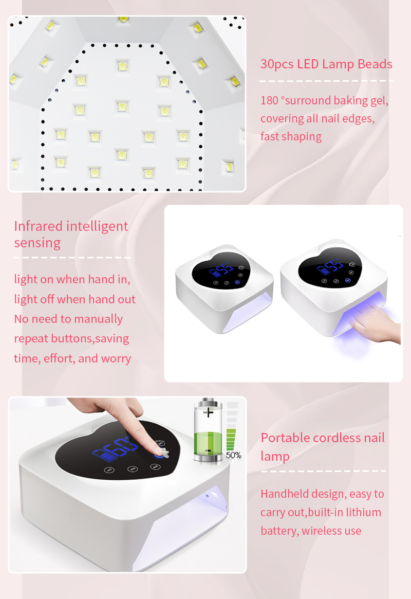 이 제품은 수축 없이 균일한 접착제 건조를 보장합니다. 듀얼 광원이 부드러운 발열을 제공하여 손 변색과 눈의 피로를 방지하고 손과 발 모두에 적합하며 매우 빠른 건조 결과를 제공합니다.