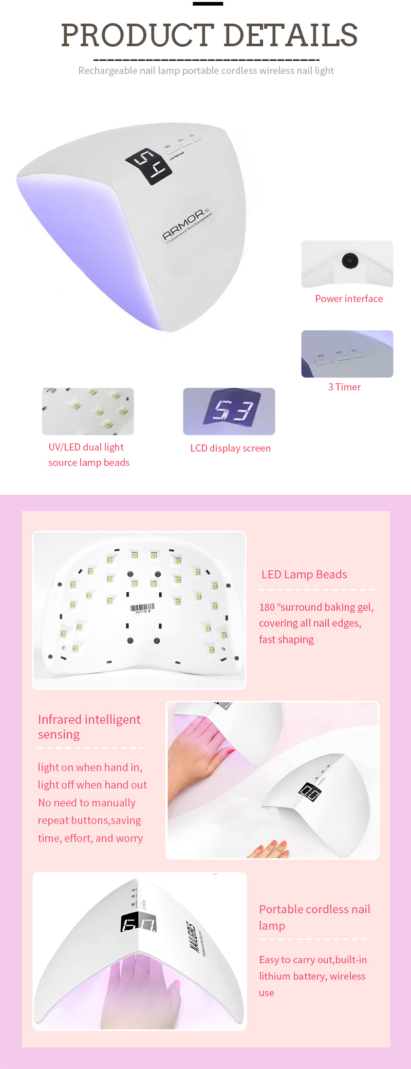 이 제품은 수축 없이 균일한 접착제 건조를 보장합니다. 듀얼 광원이 부드러운 발열을 제공하여 손 변색과 눈의 피로를 방지하고 손과 발 모두에 적합하며 매우 빠른 건조 결과를 제공합니다.