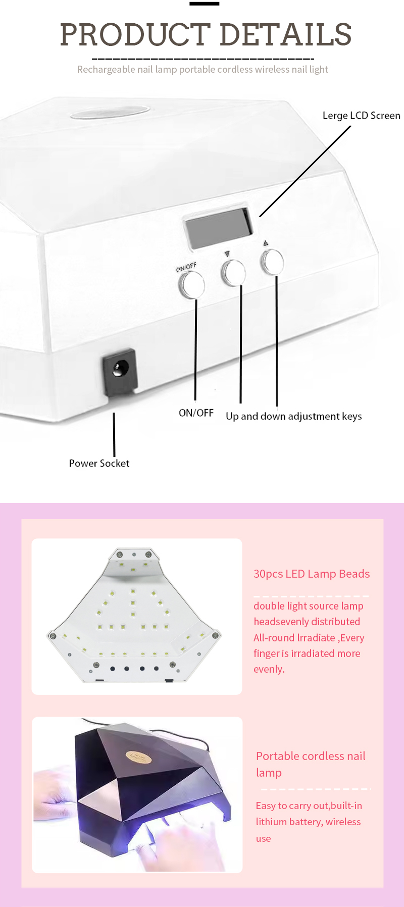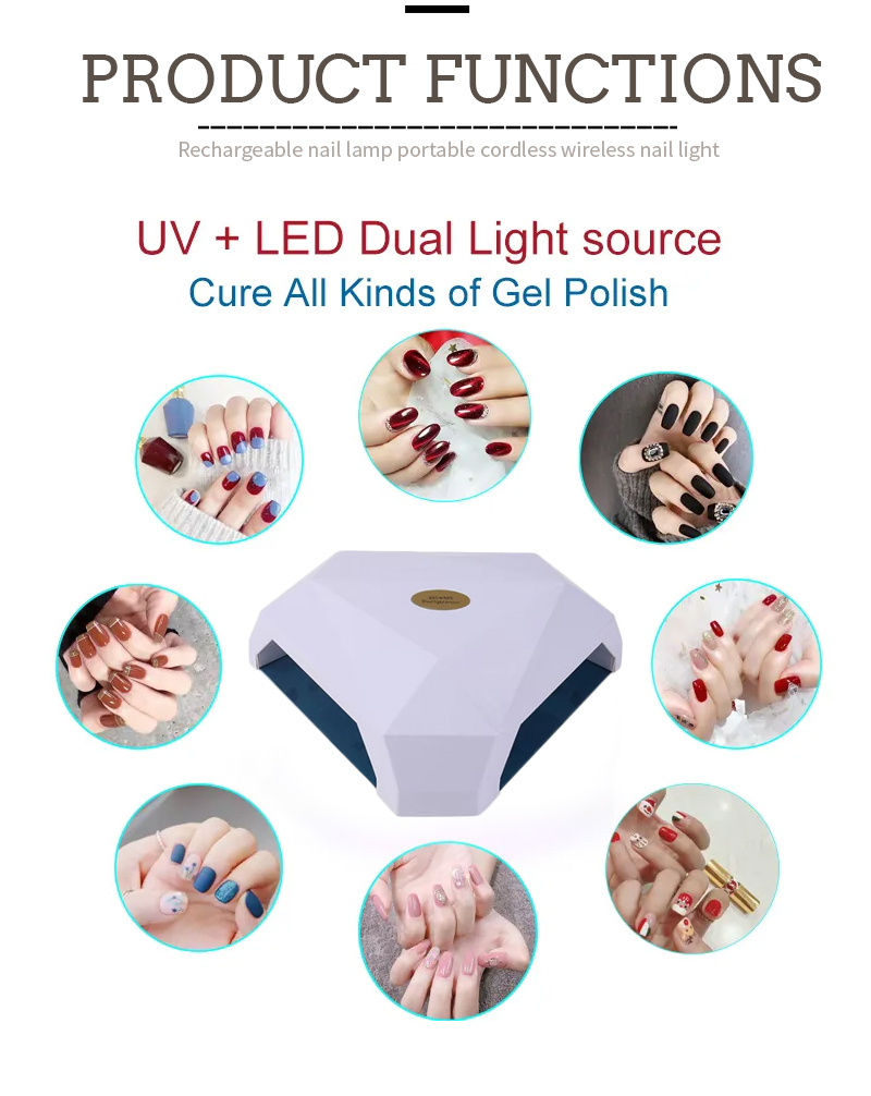 이 제품은 수축 없이 균일한 접착제 건조를 보장합니다. 듀얼 광원이 부드러운 발열을 제공하여 손 변색과 눈의 피로를 방지하고 손과 발 모두에 적합하며 매우 빠른 건조 결과를 제공합니다.
