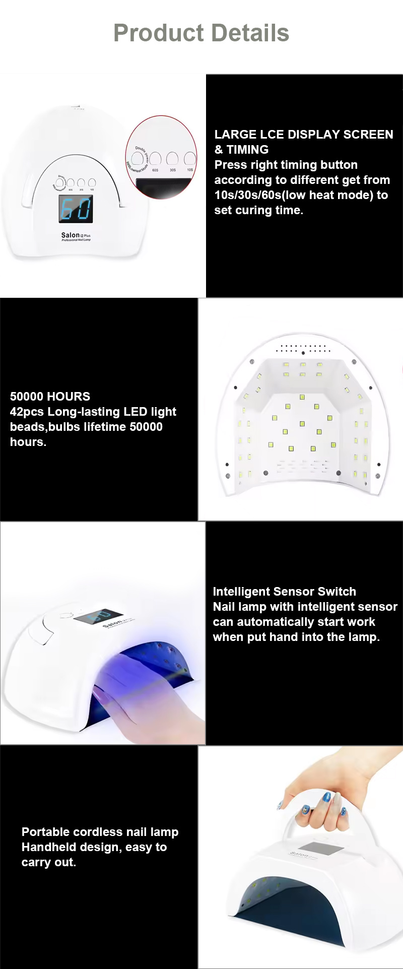 이 제품은 수축 없이 균일한 접착제 건조를 보장합니다. 듀얼 광원이 부드러운 발열을 제공하여 손 변색과 눈의 피로를 방지하고 손과 발 모두에 적합하며 매우 빠른 건조 결과를 제공합니다.