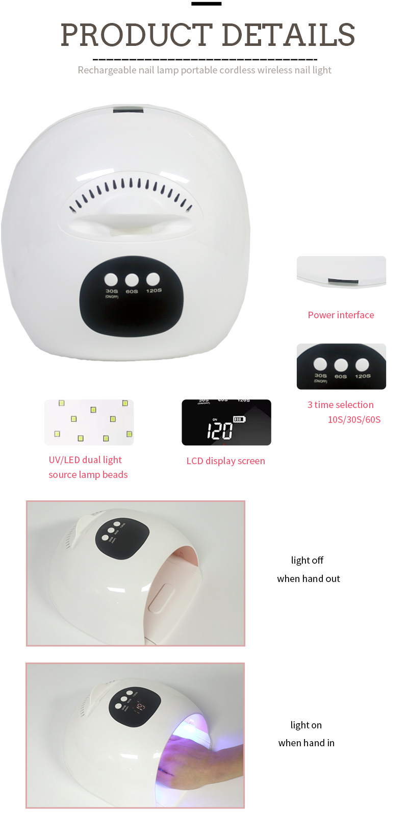 이 제품은 수축 없이 균일한 접착제 건조를 보장합니다. 듀얼 광원이 부드러운 발열을 제공하여 손 변색과 눈의 피로를 방지하고 손과 발 모두에 적합하며 매우 빠른 건조 결과를 제공합니다.