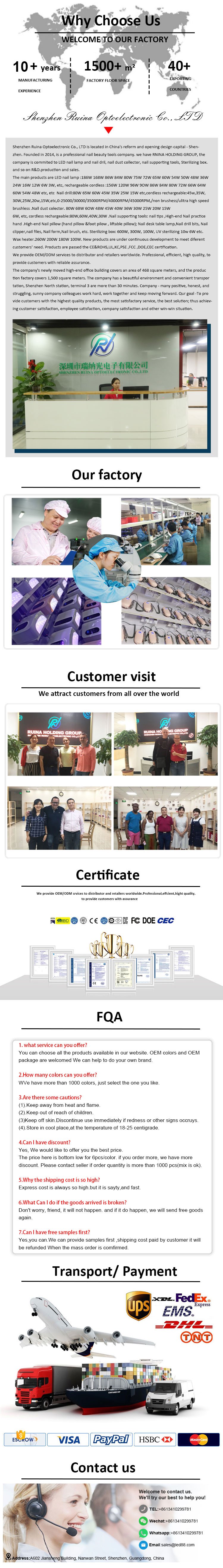 한국어Shenzhen Ruina Optoelectronics Co., Ltd.는 고효율 네일 LED 램프의 중국 최고의 제조업체, 공급업체 및 수출업체로서 완벽한 품질을 추구한다는 철학을 일관되게 유지합니다. 이러한 노력으로 당사의 가정용 UV 접착 네일 램프는 수많은 고객들의 신뢰를 얻었습니다. 뛰어난 디자인, 프리미엄 원자재, 탁월한 성능, 경쟁력 있는 가격 등 모든 고객이 기대하는 바가 바로 우리가 제공하는 것입니다. 물론 포괄적인 애프터 서비스도 마찬가지로 필수 불가결합니다.