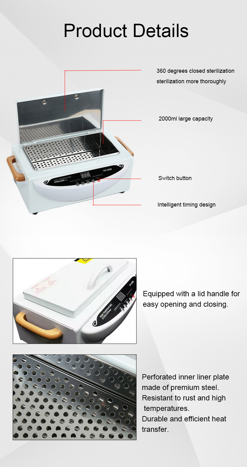 이 소독기는 주로 가열 링을 통해 열을 발생시키며 높은 온도를 소독에 활용합니다.