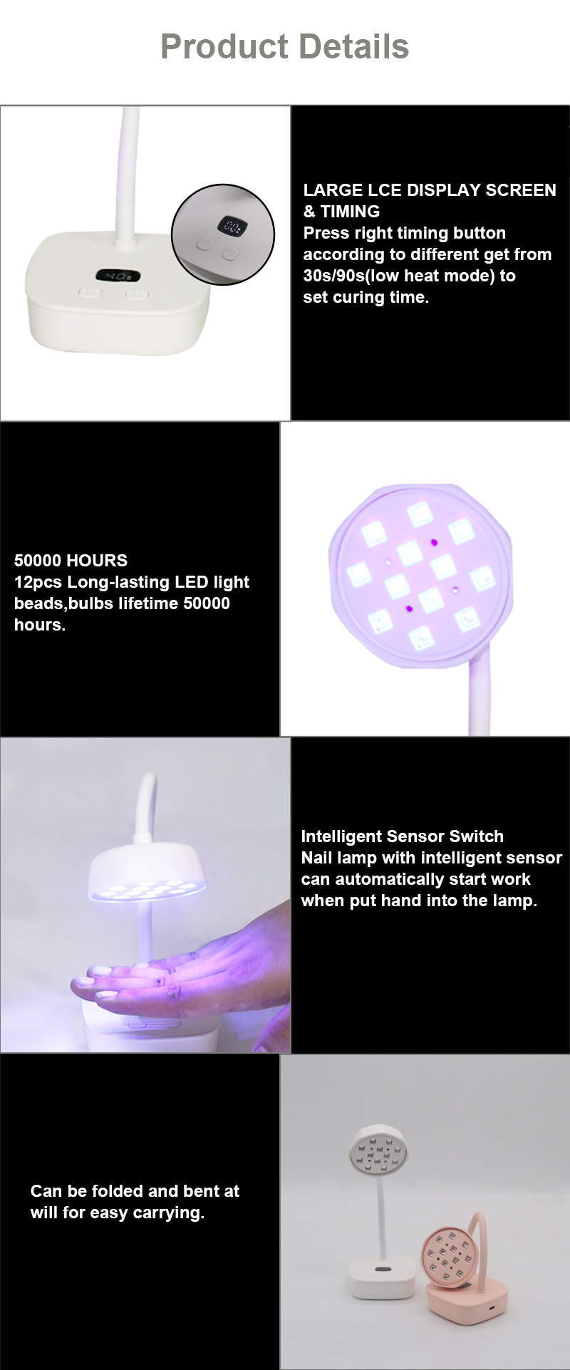 이 제품은 수축 없이 균일한 접착제 건조를 보장합니다. 듀얼 광원이 부드러운 발열을 제공하여 손 변색과 눈의 피로를 방지하고 손과 발 모두에 적합하며 매우 빠른 건조 결과를 제공합니다.