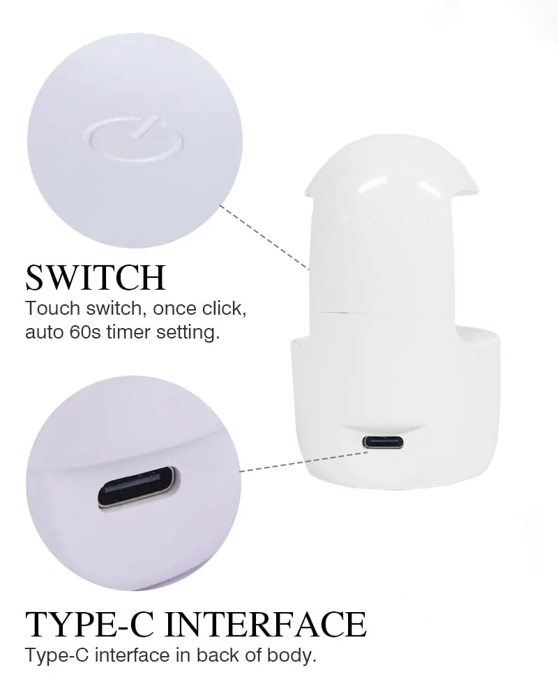 미니 원핑거 네일 램프는 수축 없이 균일한 접착제 건조를 보장합니다. 듀얼 광원이 부드러운 발열을 제공하여 손 변색과 눈의 피로를 방지하고 손과 발 모두에 적합하며 매우 빠른 건조 결과를 제공합니다.
