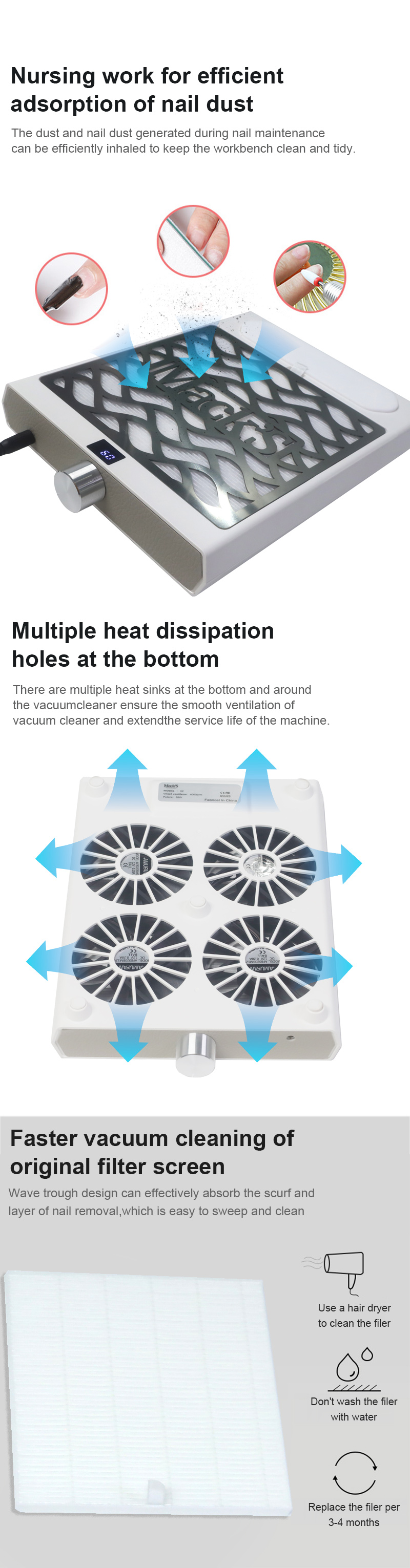 손톱 잔해의 강력한 흡착력으로 먼지가 새지 않고 조리대를 깨끗하고 깔끔하게 유지하며 빠른 진공 청소기로 먼지가 새지 않습니다.