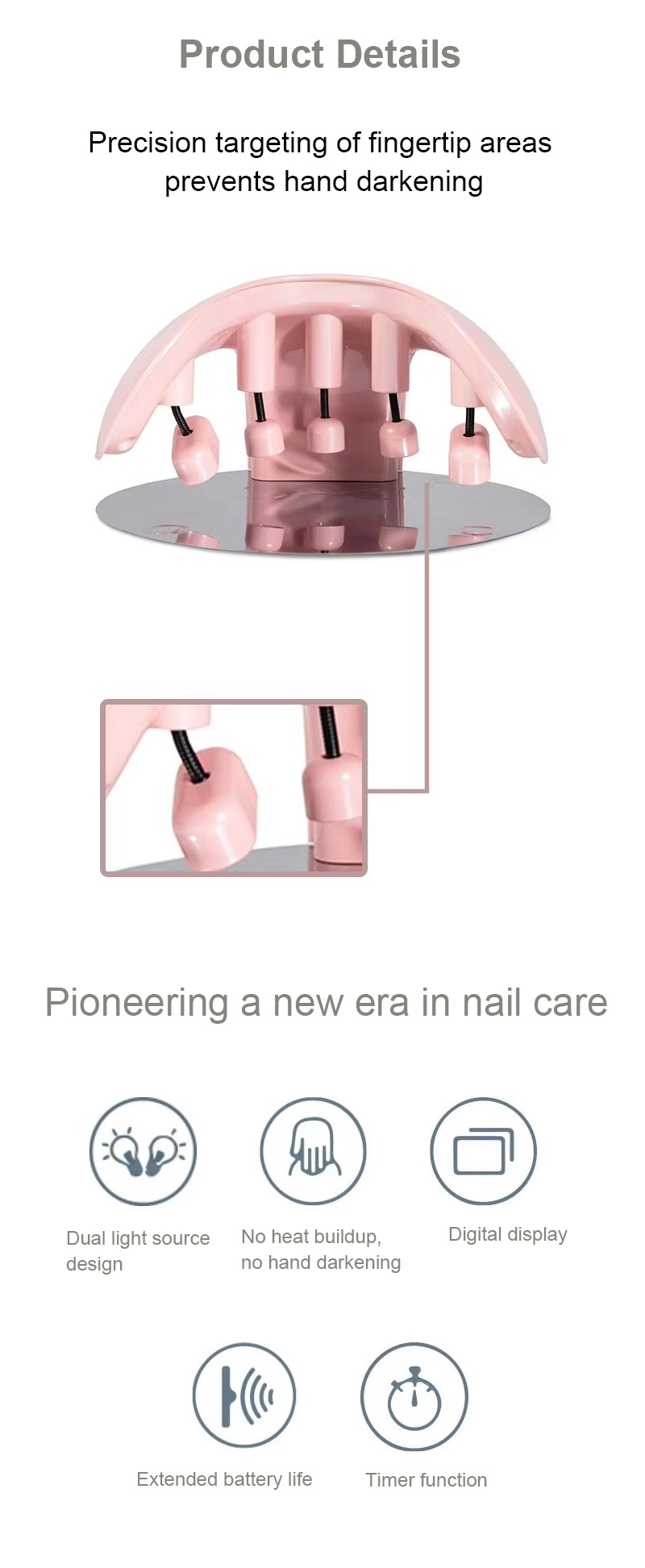 이 제품은 수축 없이 균일한 접착제 건조를 보장합니다. 듀얼 광원이 부드러운 발열을 제공하여 손 변색과 눈의 피로를 방지하고 손과 발 모두에 적합하며 매우 빠른 건조 결과를 제공합니다.
