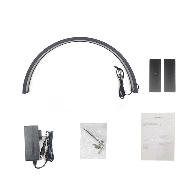 제품 패키지의 액세서리 목록에는 사용 설명서, 장착용 드라이버 및 나사, 전원 어댑터, 베이스, 곡선형 조명 고정 장치가 포함되어 있습니다.