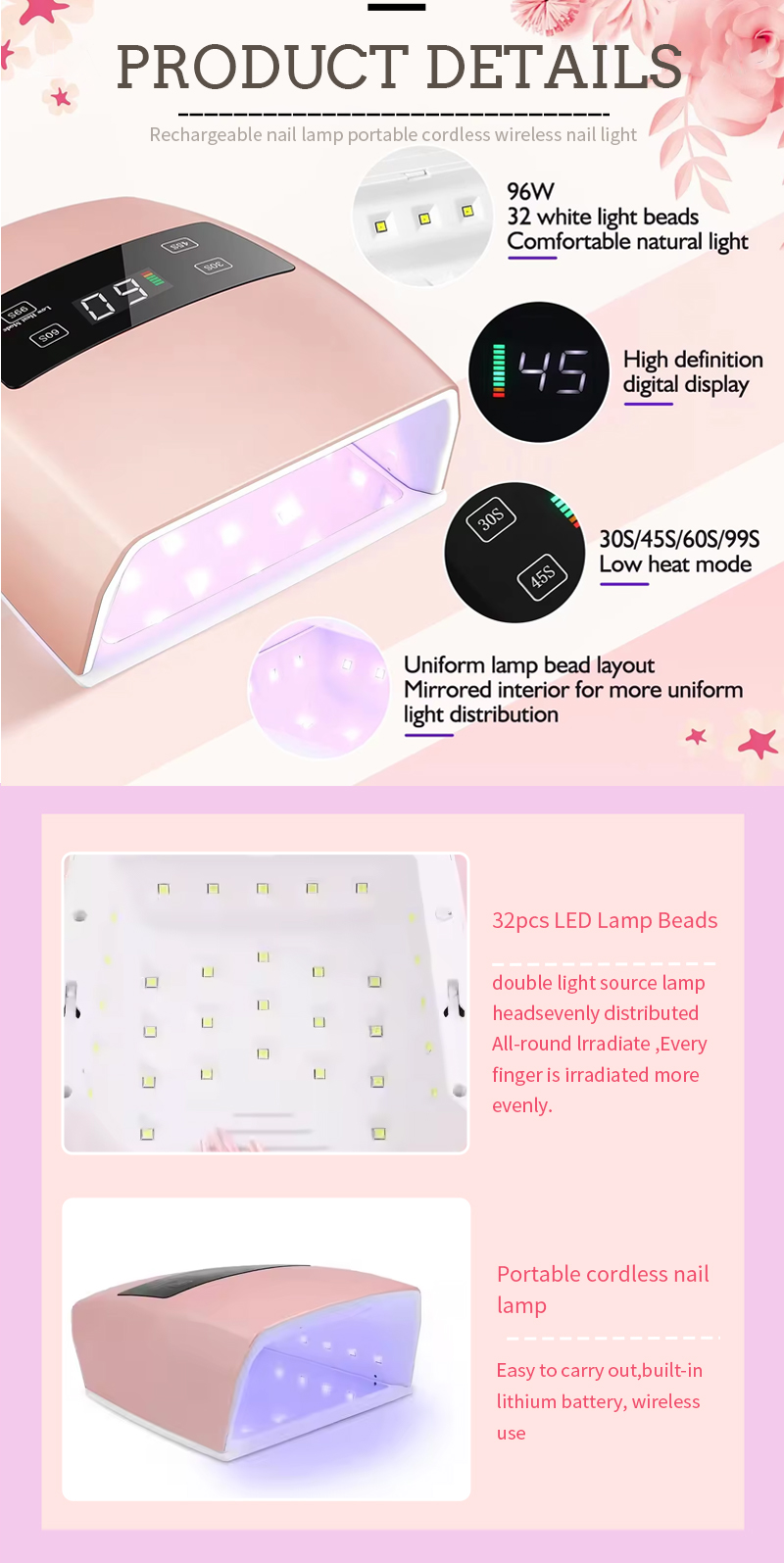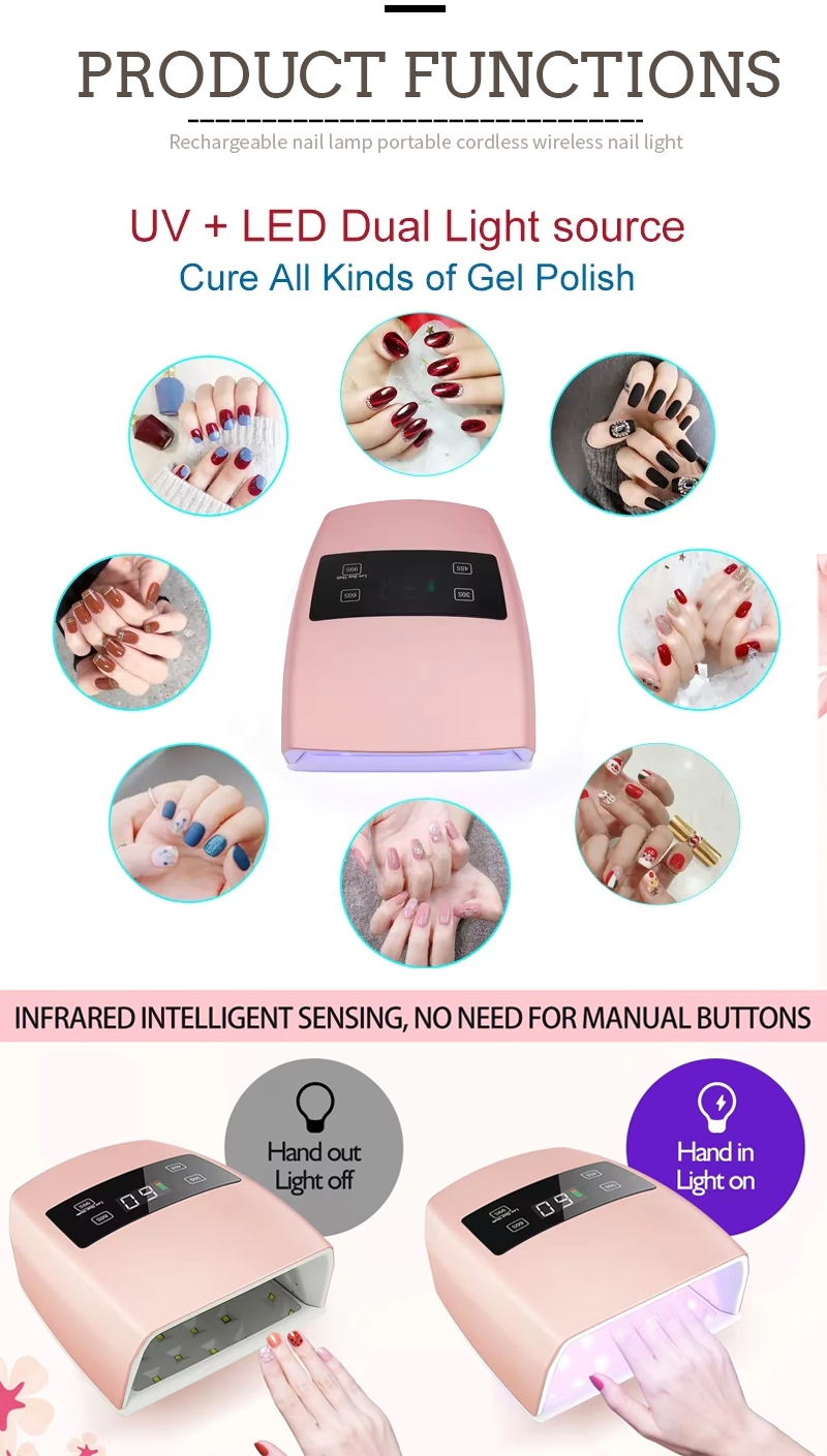 이 제품은 수축 없이 균일한 접착제 건조를 보장합니다. 듀얼 광원이 부드러운 발열을 제공하여 손 변색과 눈의 피로를 방지하고 손과 발 모두에 적합하며 매우 빠른 건조 결과를 제공합니다.